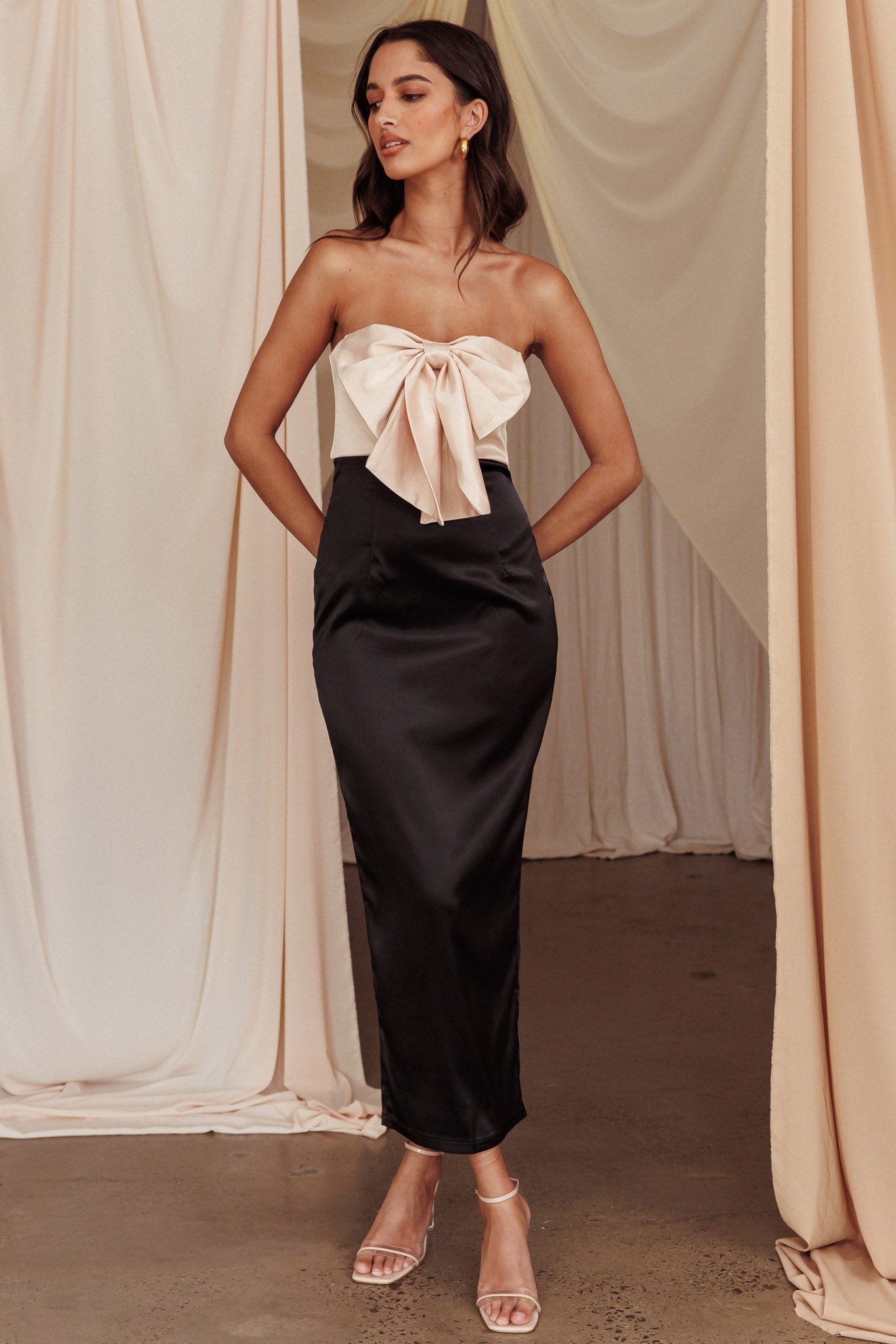 You will sweep them off their feet in our stunning Coquette midi dress. It features an adorable bow detail in the bust and a strapless design and is perfect for a wedding or special occasion. Team it with tie-up heels and a clutch for an unforgettable look.